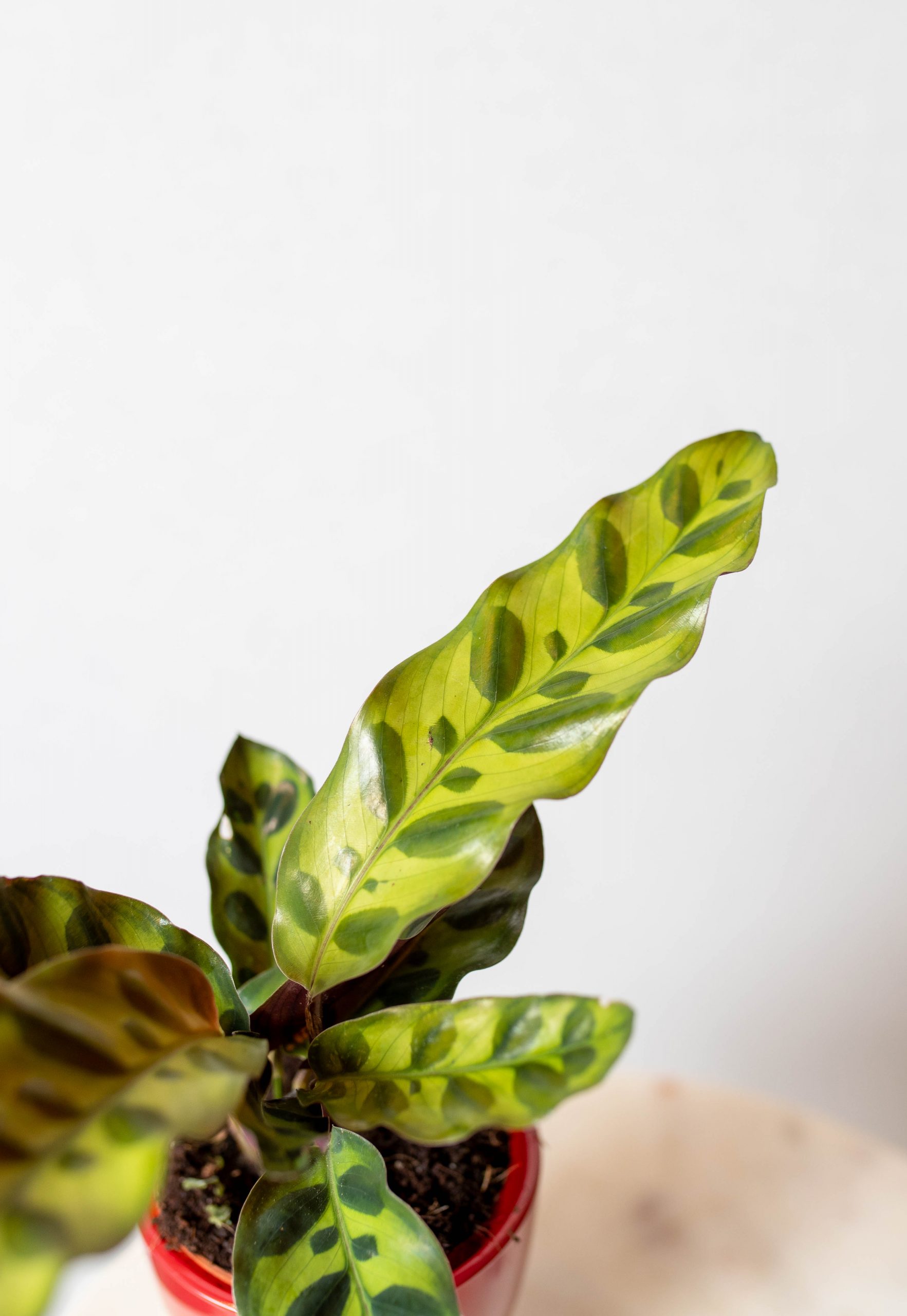 The Calathea lancifolia is a great showy plant to add to any collection. The lancifolia has beautiful variegated leaves with hint of dark green and pale green. The The undersides are a burgundy red and velvety to the touch. The Calathea’s love high humidity, so perfect for either a bathroom or kitchen.